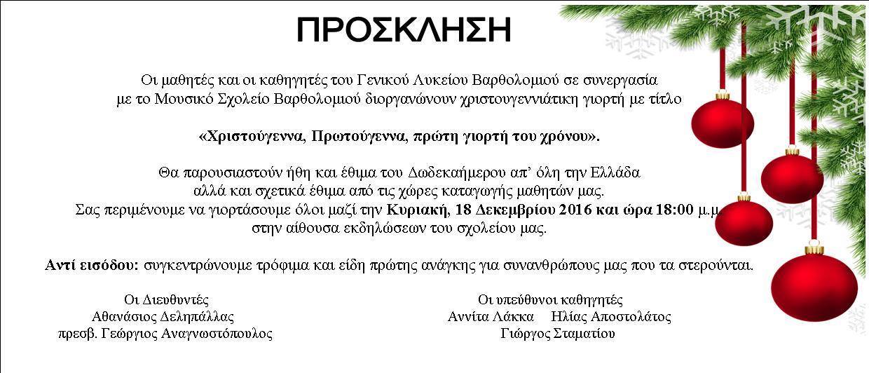 Χριστουγεννιάτικη Γιορτή – Πρόσκληση lyk_admin | 13 Δεκεμβρίου 2016 | Γιορτές, Δράσεις | Δεν υπάρχουν Σχόλια Την Κυριακή 18 Δεκεμβρίου 2016 και ώρα 18:00 μ.μ. στην αίθουσα εκδηλώσεων του σχολείου μας θα πραγματοποιηθεί Χριστουγεννιάτικη γιορτή με τίτλο: “Χριστούγεννα, Πρωτούγεννα, πρώτη γιορτή το χρόνου “ Related Posts Οι μαθητές του ΓΕΛ Βαρθολομιού έστειλαν ανθρωπιστική βοήθεια στην Κω για τους πρόσφυγες Δεν υπάρχουν Σχόλια | Ιαν 15, 2016 ΑΙΜΟΔΟΣΙΑ Δεν υπάρχουν Σχόλια | Μαρ 16, 2016 ΣΥΓΚΕΝΤΡΩΣΗ ΡΟΥΧΩΝ ΚΑΙ ΤΡΟΦΙΜΩΝ ΜΑΚΡΑΣ ΔΙΑΡΚΕΙΑΣ ΓΙΑ ΤΟΥΣ ΠΡΟΣΦΥΓΕΣ Δεν υπάρχουν Σχόλια | Δεκ 13, 2015 Δράση Ινστιτούτο Οδικής Ασφάλειας Δεν υπάρχουν Σχόλια | Μαρ 24, 2025 About The Author ΔΙαχειριστής