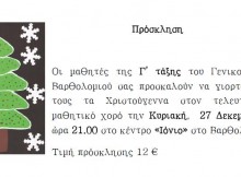 Οι μαθητές της Γ? τάξης του Γενικού Λυκείου Βαρθολομιού σας προσκαλούν να γιορτάσετε μαζί τους τα Χριστούγεννα στον τελευταίο τους μαθητικό χορό την Κυριακή, 27 Δεκεμβρίου, και ώρα